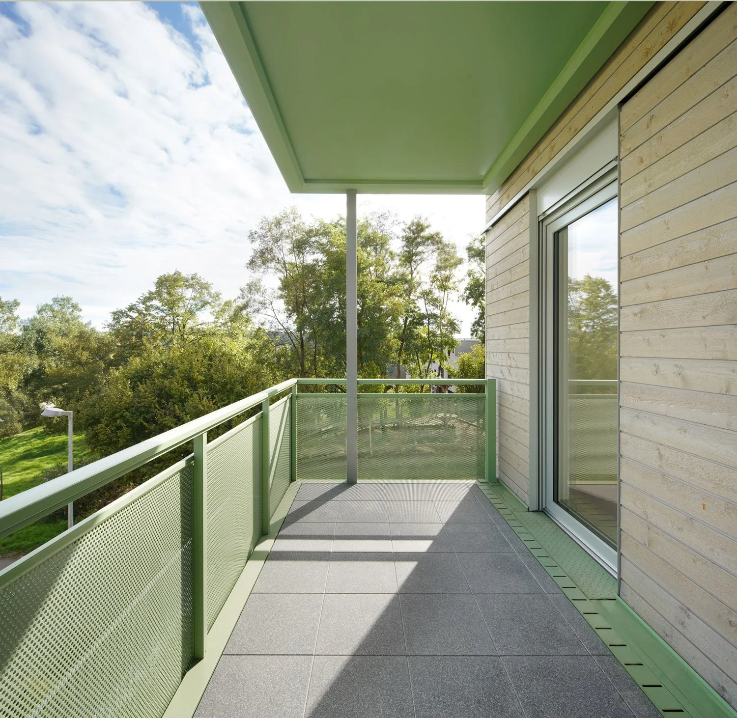 Alle Wohnungen sind barrierefrei, schwellenlos und verfügen über einen privaten Außenraum in Form von Balkonen oder Terrassen. Die barrierefreien Bäder sind als sich wiederholende Typen geplant. Innerhalb dieser Struktur werden unterschiedliche Wohnungstypen angeboten. Auf sich verändernde Wohnbedürfnisse im Alter kann innerhalb des Ausbaus mit leichten Trennwänden sehr gut reagiert werden. Aber auch ohne Umbau ist eine Umnutzung der Wohnung sehr gut möglich, da alle Räume als nutzungsneutrale Räume gleicher Größe konzipiert sind.