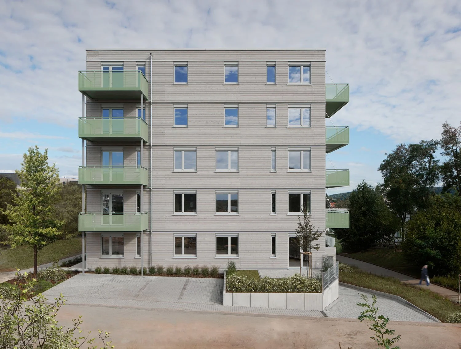 Das Wohngebäude ist als Punkthaus mit innenliegendem Treppenhaus konzipiert und wird durch seine Größe und Höhe zum Orientierungspunkt am Grünzug mitten im Quartier. Ein Gemeinschaftsraum im Erdgeschoss ergänzt die individuellen Wohneinheiten.